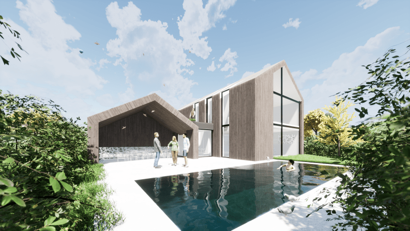 Das Wohnhaus und sowie die Garage bestehen aus zwei optisch harmonierenden Baukörpern, welche durch den Eingangsbereich miteinandner verbunden sind. Das Wohngebäude zeichnet sich vor allem durch seine offene zweigeschossigkeit, die Lichtdurchdringung und das komplexe Raumgefüge im Inneren aus. Mehrere Galerien, Brücken und erweiterte Raumhöhen sorgen für ein spannendes Innenleben.